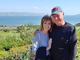 Mom and Dad in Israel, 2019: North shore of the Sea of Galilee, top left; on a boat on the Sea of Galilee, bottom left; Southern Steps of the Temple Mount in Jerusalem, right.